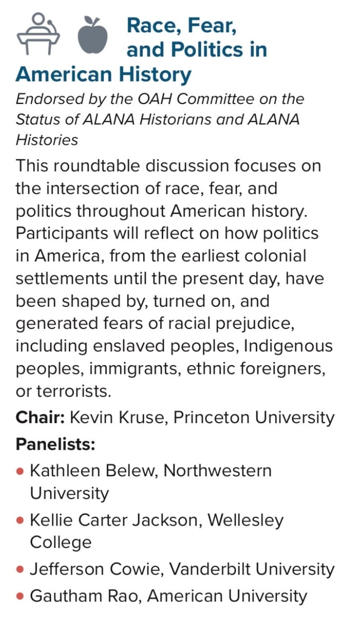 On Thursday, April 16, 2026, I was honored to join a group of incredible scholars for a roundtable panel on “Race, Fear, and Politics in American History” at the Organization of American Historians (OAH) annual conference in Philadelphia. Although Kathleen Belew was unable to join the group, I was still completely blown away by my amazing co-panelists: Kevin Kruse of Princeton, Kellie Carter-Jackson of Wellesley, and Jefferson Cowie of Vanderbilt. It was a fascinating discussion for a group of folks coming at a similar topic from very different vantage points: Jeff was thinking through the history of Barbour County, Alabama, which he of course explored so magnificently in his Freedom’s Dominion: A Saga of White Resistance to Federal Power (2023); Kellie brought wide-ranging insights but was also referencing her recent, truly remarkable book, We Refuse: A Forceful History of Black Resistance (2024).